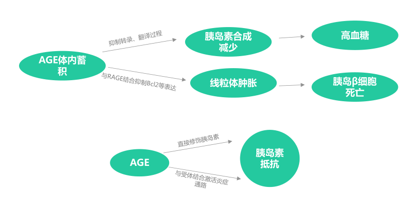 过量蓄积的AGE通过多种途径,导致β细胞受损、胰岛素抵抗,形成糖尿病早期阶段,并进一步发展成高血糖和糖尿病。AGE是糖尿病早期风险因子!