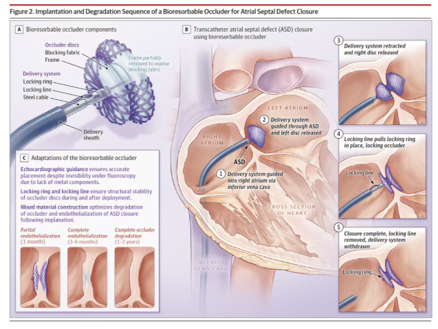 房间隔缺损是最常见的先天性心脏病之一,传统介入治疗使用金属封堵器封闭缺损。金属器械将永久存留于患者体内,不仅可能引发心律失常、组织侵蚀、血栓形成等远期并发症,还会影响未来可能进行的左心房入路手术,成为悬在患者心中的“定时炸弹”。研发一种能在完成使命后“功成身退”的可降解封堵器,成为全球心血管学界共同努力的方向。