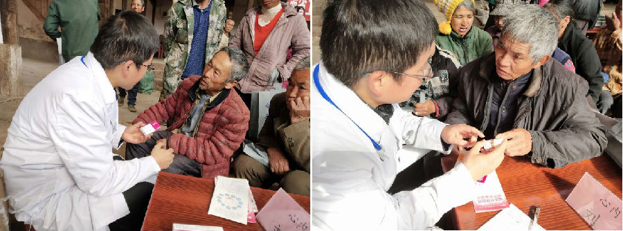 心内科专家刘帆为坝心镇邑北孔村民义诊,并指导用药。
