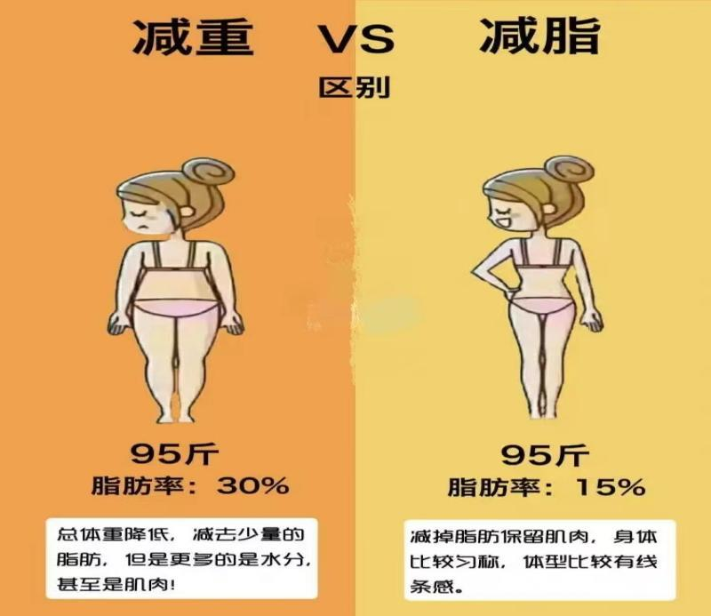 比如同样95斤的人,体脂率30%与15%的体型差异显著——前者可能减掉的是水分甚至肌肉,后者则是减脂留肌,体型更紧致、线条更明显。因此,“减重”≠“减脂”,关注体脂率才是核心。