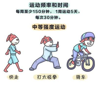 1.每周至少150分钟中等强度运动(如快走、骑车、打太极拳),可分5天进行,每次30分钟;