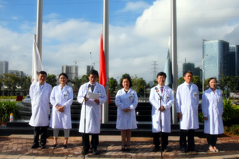 在宋万永副院长和马骏助理的监誓下,由两名职工代表领誓《中国医师宣言》及《中国护士誓言》,面对国旗和院旗全体新职工庄严宣誓:要牢记使命,弘扬精神,恪守职责,勤奋工作,为医院发展贡献自己的力量。