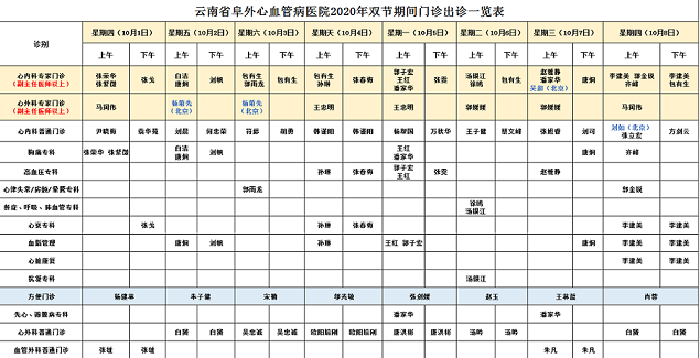 2020年国庆节期间门诊排班