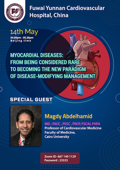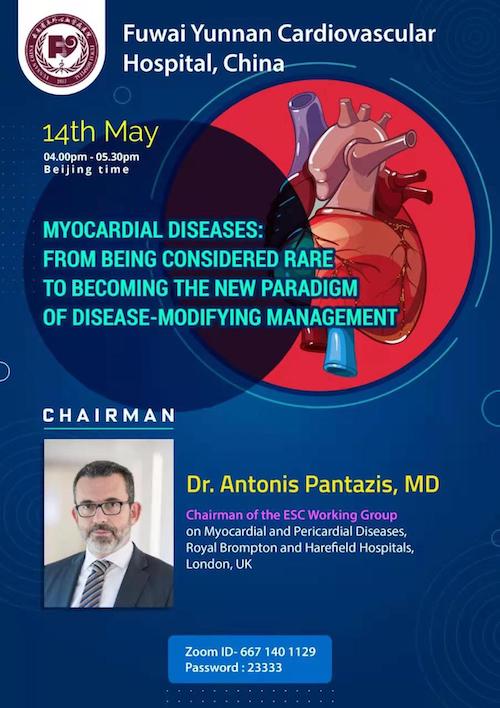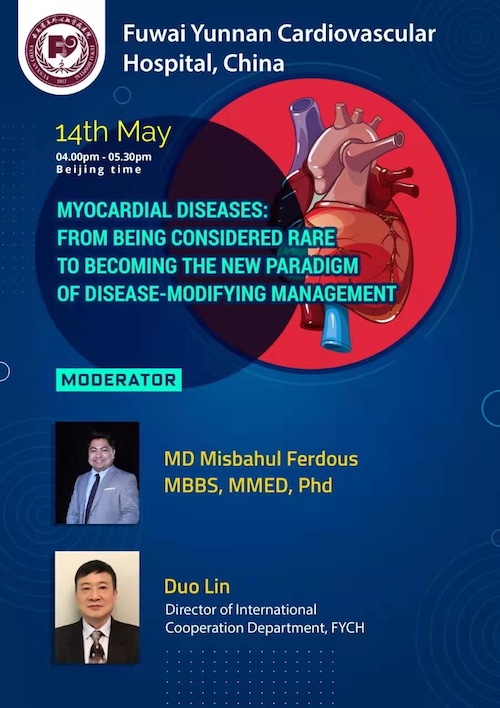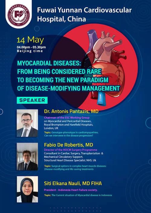 2021年5月14日,在云南省卫生健康委支持下,在医科院阜外医院专家指导下,云南省阜外心血管病医院与欧洲心脏协会(European Society of Cardiology)合作,举办了2021年第一期“‘一带一路’心肌疾病经验分享会”的网络视频会议,会议主题为心肌疾病:从被认为罕见到成为疾病修正管理的新范式(Myocardial Diseases: From Being Considered Rare to Becoming The New Paradigm of Disease-Modifying Management)。