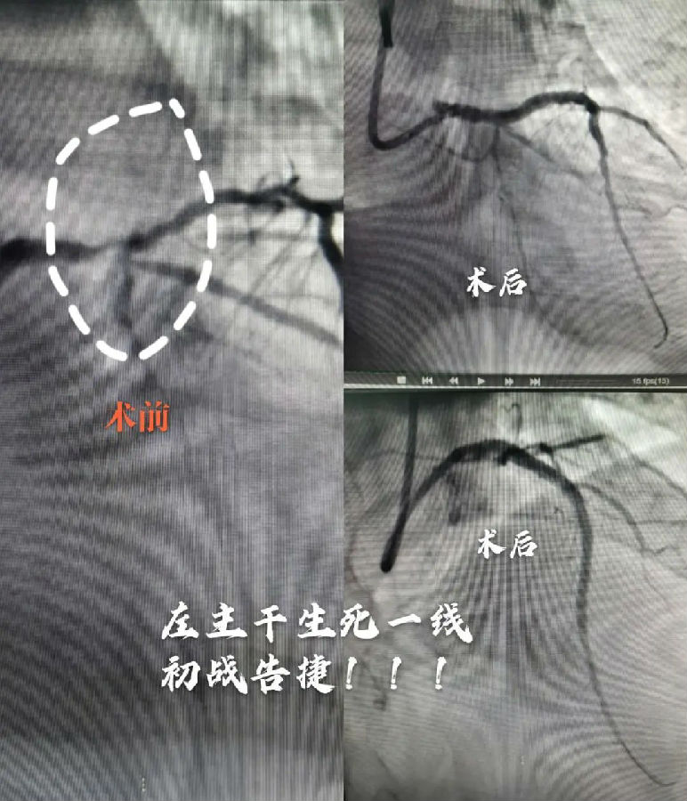 患者张某,今年50岁,2周前因急性下壁心梗在外院行急诊PCI,术中发现冠状动脉左主干+三支病变,左主干严重狭窄95%,当时开通梗死相关动脉右冠,植入支架2枚,但术中显示患者右冠状动脉钙化严重,支架显著膨胀不良,术中反复高压后扩张,也无法啃下这块硬骨头。