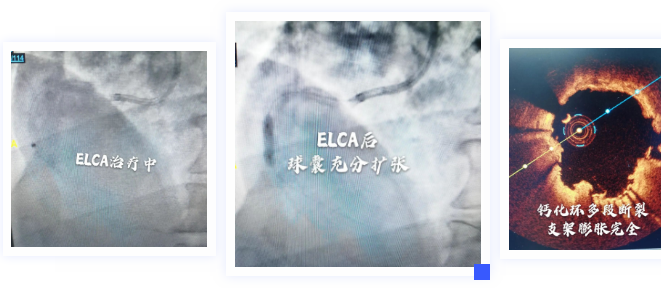 目前常规应对冠脉严重钙化病变致支架膨胀不全的方法有支架内高压充分后扩张、支架旋磨等,但效果仍不确切,且冠脉破裂、磨头嵌顿等风险较高。我院于近期引进了西南地区第一台准分子激光消融仪,可为此类患者带来福音,ELCA利用氙氦准分子激光脉冲式发射,可充分对支架外钙化斑块进行充分消噬、爆裂,使得后扩张球囊最终能够充分扩张支架,使其膨胀完全。