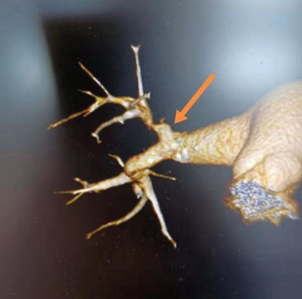 肺动脉增强CT检查发现: 右上肺动脉主干重度狭窄,狭窄处仅1.5mm。