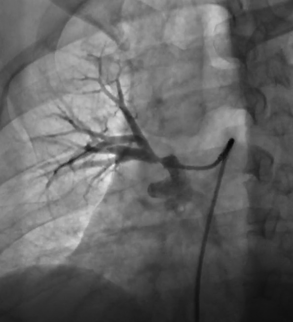 首先选择性肺动脉造影:显示右上肺动脉开口处严重狭窄。
