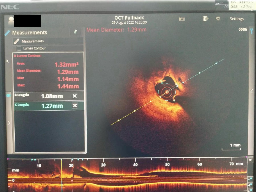光学相关成像(OCT)显示右上肺动脉狭窄病变程度与宽度。