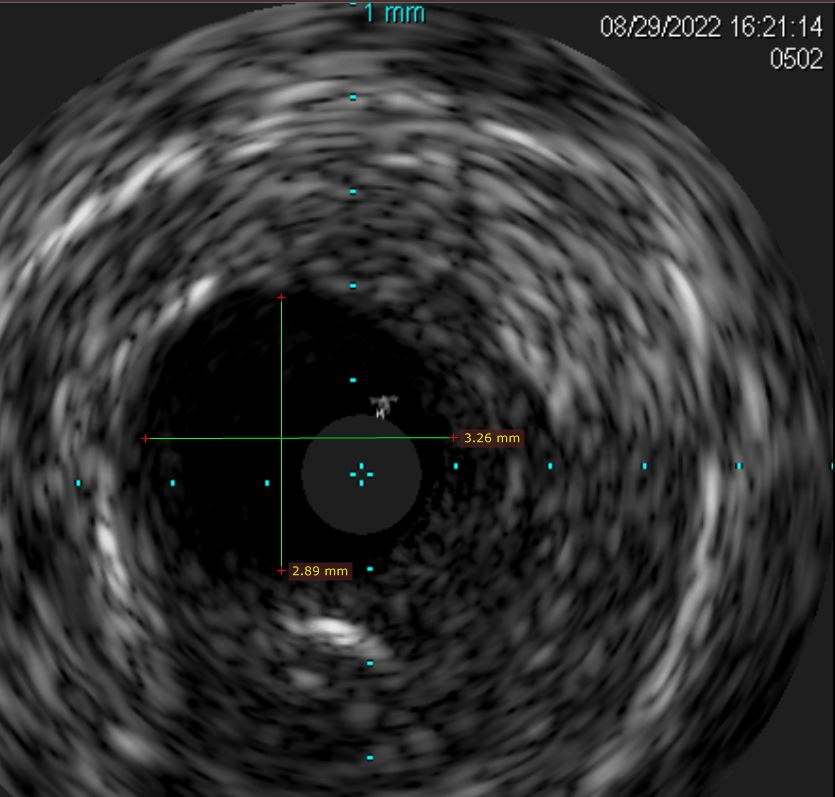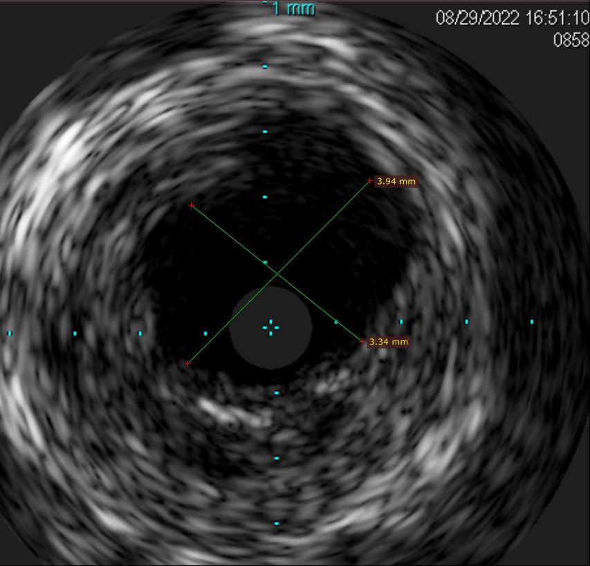 经治疗后右上肺近端狭窄病变血管经相控阵血管内超声(IVUS)测量明显扩大,血流恢复到正常水平。