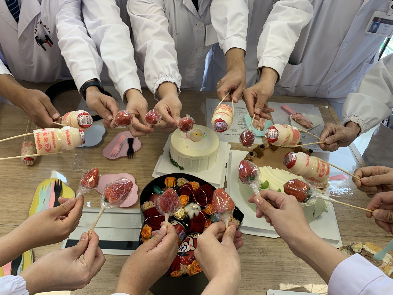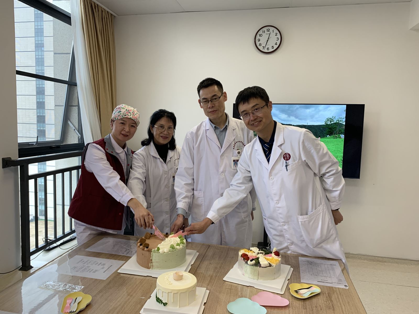 李建美主任、崔成主任、郑甲林主任和王敬思护士长带领科室全体医护人员共庆建科两周年。