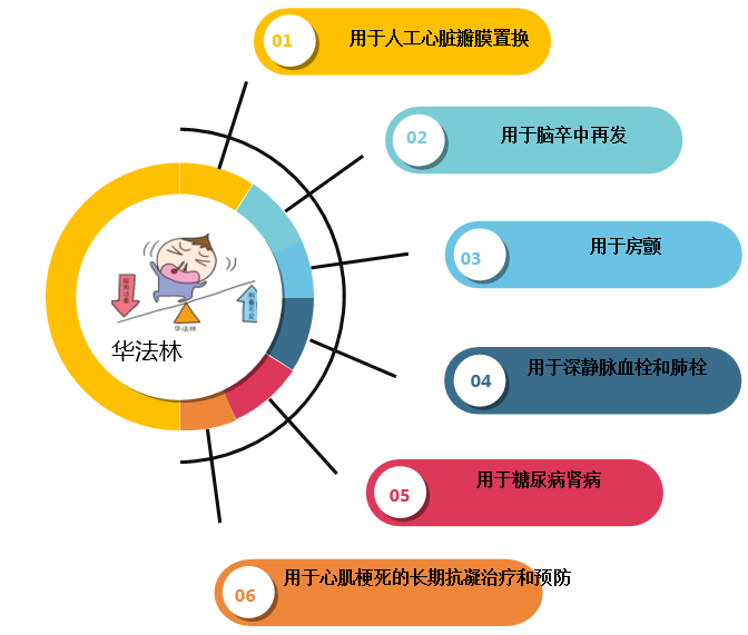 华法林(Warfarin)是一种口服抗凝药物,它能抑制新的血栓形成,血栓脱落和栓塞的发生,有利于已经形成的血栓的清除。华法林被广泛用于人工心脏瓣膜置换术后、房颤、脑卒中再发、深静脉血栓和肺栓塞、糖尿病肾病、心肌梗死的长期抗凝治疗和预防。在口服抗凝治疗中具有无可替代的地位,并且是当今抗凝治疗的首选药。