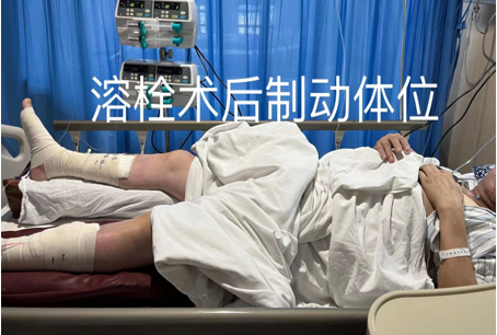 ◆置溶栓导管返回病房后,患者平卧位,置管溶栓期间抬高患肢20-30度,膝关节屈曲15度,穿刺侧肢体伸直制动,禁止弯曲,蜷缩,防止穿刺点出血及溶栓管移位。