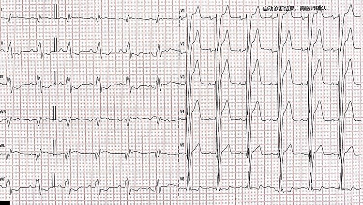 图5 左右室同时起搏患者心电图(QRS波:120ms)