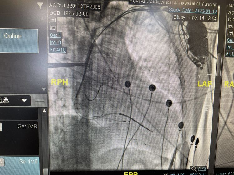 2022年1月12日,云南省阜外心血管病医院心律失常中心为一位56岁(男)患者成功植入一台CRT-D。该患者术前:反复胸闷、气促4年;患者于4年前始出现活动时发作性胸闷、气促,无大汗、恶心、呕吐、晕厥等症状,无明显双下肢水肿,夜阵发性呼吸困难等;超声心动图检查:LA:51mm, LV:73mm, EF:26%,再结合患者胸片、心电图。诊断为:扩张型心肌病、心脏扩大、完全性左束支传导阻滞、心功能II级(NYHA分级)。