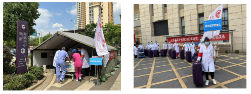 随后进行了地震逃生救护演练,地震来临,医院应急广播响起,各科医护人员迅速带领患者及家属用枕头、书本等护住头,蹲在墙角、桌下、病床下等安全地点;强震过后,各科医护人员将患者有序撤离到指定地点集合。演练中,医院组建的医疗救护队立即前往各科室搜救伤员,并将受伤人员送至临时医疗点进行救治,整个过程紧张有序。同时医院医疗救援队带上救援物资,紧急支援灾区。