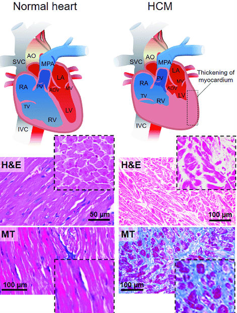 主要表现为心肌细胞肥大、排列紊乱及纤维化;心肌间质小冠状动脉异常(管壁增厚、管腔缩小)。