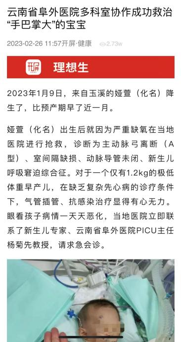 近日,一则新闻吸引了各界关注,一名仅1.2kg的重症先心患儿成功实施根治手术后在云南省阜外心血管病医院度过了自己的第一个春节,并于2月下旬顺利出院。