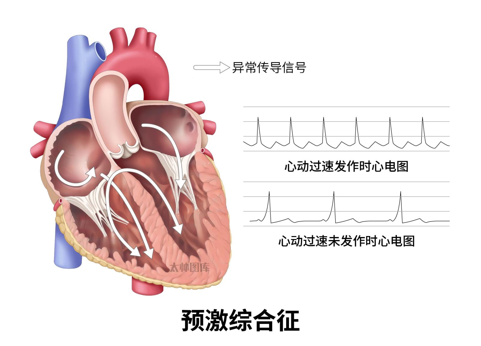房室之间多出来一条电路,很容易出现“短路”现象,“电流”将提前到达心室,这种情况下,“电流”也有可能在“正常电路”和“短路电路”之间快速循环传导,就会导致心率突然急剧加速,即为预激综合征。