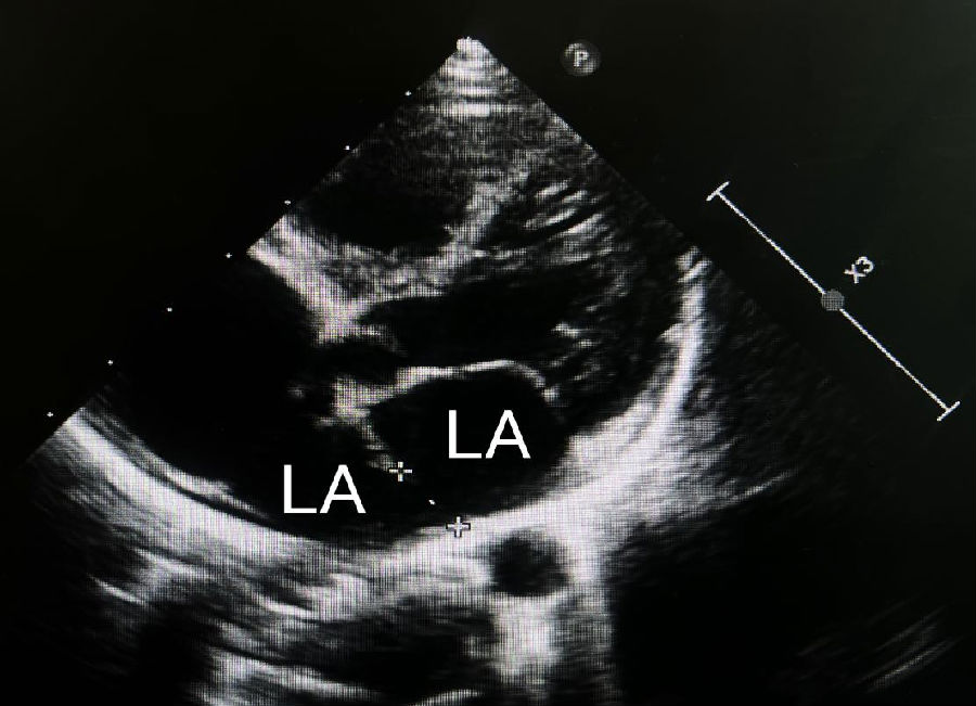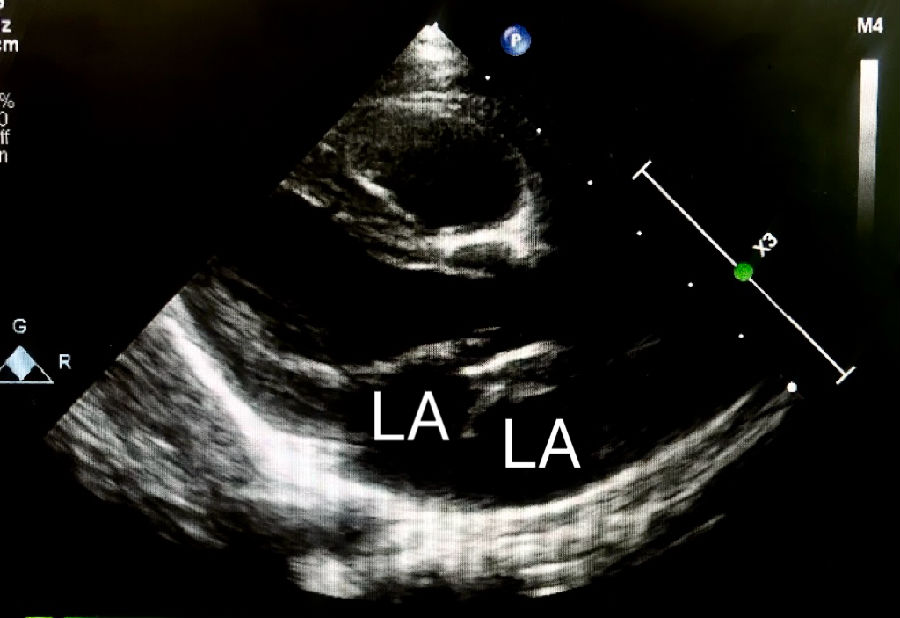 在体检中,有时可以通过听诊检测到心脏杂音。杂音的强度取决于血流通过隔膜的速度。超声心动图(经胸或经食道)是评估三房心解剖学和生理学的主要成像方式,彩色多普勒下的花色血流信号通常表示血流的加速和湍流的出现,这表明可以通过血流通过隔膜时可能有梗阻。经食管超声心动图的成像优于经胸超声心动图,可以明确的诊断三房心,并区分真正的左心房、左心房附属物以及隔膜的形态和梗阻程度。三维超声心动图是一种新的诊断工具,可以给临床提供额外的信息,能够明确隔膜的大小、位置和开口数量等。