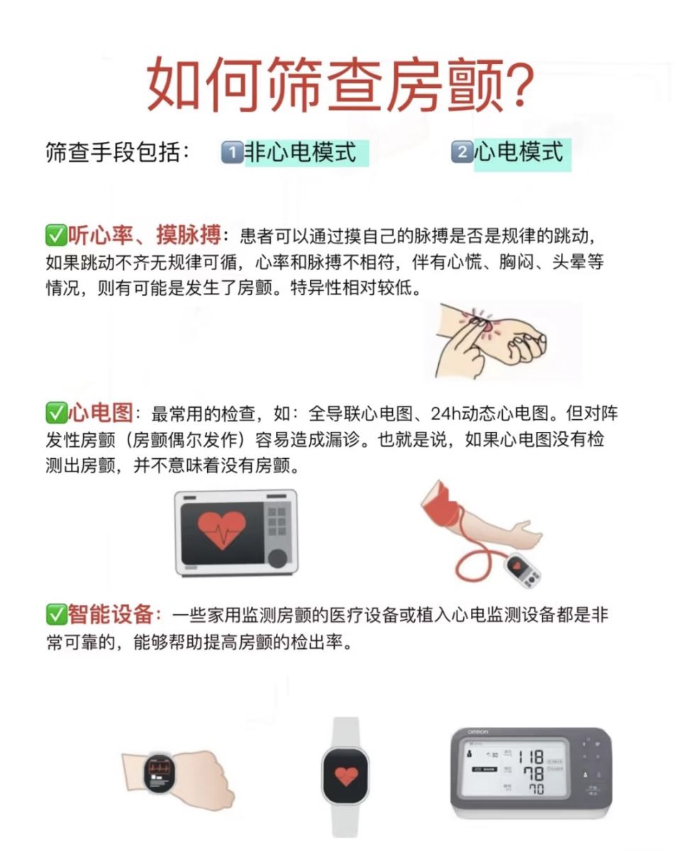 初步筛查隐匿性房颤可以采取触脉搏或普通心电图检查。目前,很多医院的门诊部设有快速的房颤筛查设备,可以快速准确地诊断房颤。此外,一些智能穿戴设备,如运动手环、智能手表等,也可以用来做初步筛查。系统筛查则可以采用动态心电图检查或便携式单导联手持心电图记录系统。在特殊情况下,还可以采用植入式心电事件记录仪进行长时间的心电监测,有助于发现隐匿性房颤。