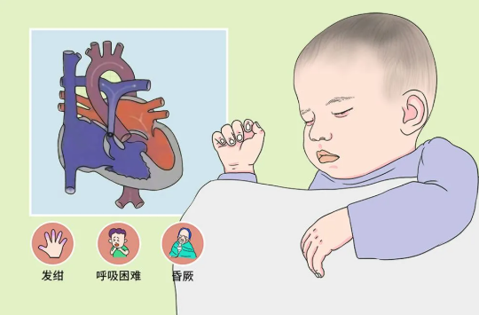 ②呼吸困难和缺氧性发作:多在出生后6个月开始出现,由于组织缺氧、活动耐力较差、动则呼吸急促,严重者可出现缺氧性发作、意识丧失或抽搐。