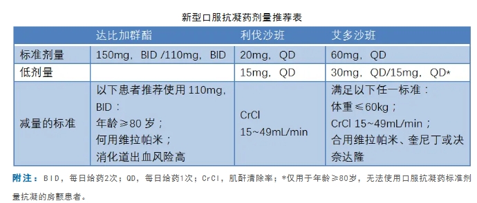 新型口服抗凝药具有良好的有效性和安全性,使用过程中无需常规监测凝血功能。相比华法林,患者服用新型口服抗凝药的依从性更好,停药率更低。新型口服抗凝药的常用剂量和减量标准如表1所示。新型口服抗凝药均不同程度经肾脏清除,肾功能不全会影响新型口服抗凝药的体内过程,CrCl<15mL/min为新型口服抗凝药的禁忌症。