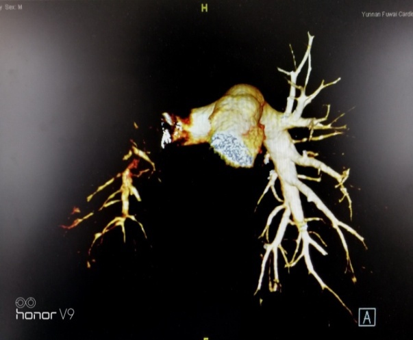 今年2月1日在云南省阜外医院内科管委会牛国栋主任和郭涛主任和医务科的帮助与协调下,在阜外医院肺血管中心赵智慧主任网络指导下,云南省阜外医院肺血管病房徐鸥主任,汤银江主任,杨凯和朱磊医生联合冠心病病房唐炯主任,在云南省阜外病医院介入室,对患者进行了BPA手术,开放了左下肺三只被堵塞的血管,手术非常成功,术后患者肺动脉压力下降,病人安返病房。