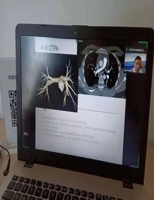 肺血管病区高度重视,随即通过网络腾讯会议联系国家心血管病中心,中国医学科学院阜外医院(简称阜外医院)肺血管中心柳志红主任,罗勤主任进行联合会诊。经充分讨论认为患者血栓主要以右肺动脉主干为主,治疗策略首先应行经皮肺动脉内膜剥脱取栓术(PEA)心外科手术,之后终身抗凝,内科进一步观察肺动脉高压改善情况。