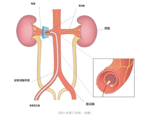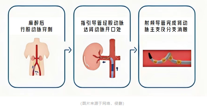 手术通常在局部麻醉下进行,医生只需要在患者的大腿根部血管开一个细小的口子(像打针一样),然后将一根消融导管送至肾动脉中,释放能量,在不损伤肾脏和血管的同时降低血管周围交感神经的活性,就能有效降低血压(包括顽固性高血压)。