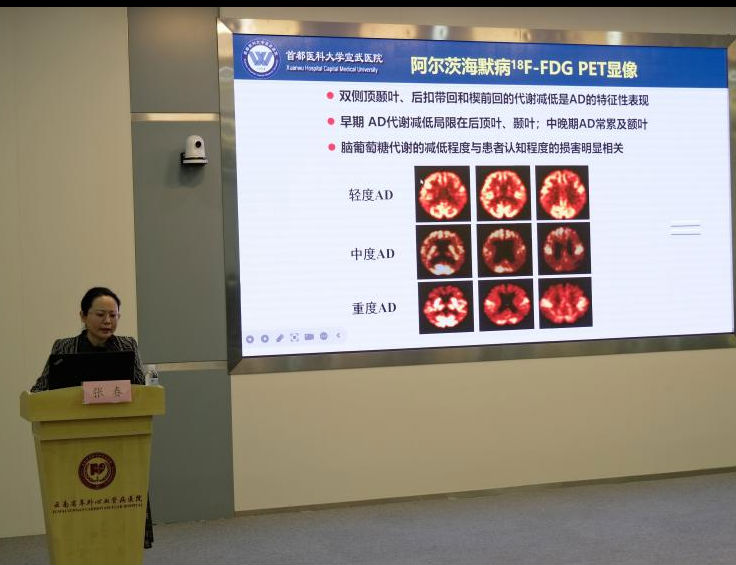 首都医科大学宣武医院放射与核医学科副主任,主任医师,教授,硕士研究生导师张春教授做“18F-FDG PET在AD诊断中的应用”专题讲座。张教授对目前核医学在AD的诊断及鉴别诊断、AD不同分型在不同放射性药物下的不同影像表现进行讲授。通过病例与漫画相结合的方式,详细地向参会学员讲述了目前AD在核医学方面的应用。