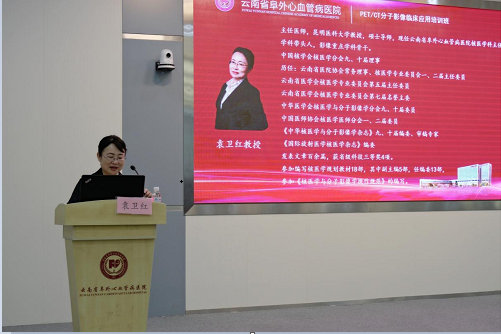 会议开始,首先由袁卫红教授作开场致辞。欢迎大家参加云南省阜外心血管病医院PET/CT分子影像临床应用培训班,同时对各位的到来表示热烈的欢迎和由衷的感谢。本次培训班聚焦于核医学分子影像诊断学在临床的应用,包括了心血管、肿瘤、神经系统的分子影像诊断。本次会议邀请了国内及省内知名专家为我们传授本学科及相关学科学术知识,期望大家学习收获满满。