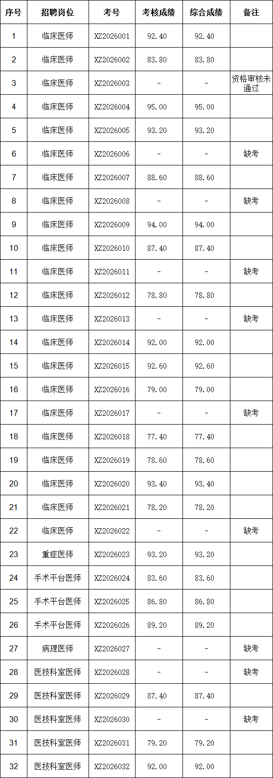 根据《云南省卫生健康委所属事业单位开展2026年校园招聘的公告》以及《云南省阜外心血管病医院2026年校园招聘考核及后续工作方案》相关要求,我院于2月10日对报考相关岗位的考生进行了第一批次考核。现将考核成绩、综合成绩进行公示: